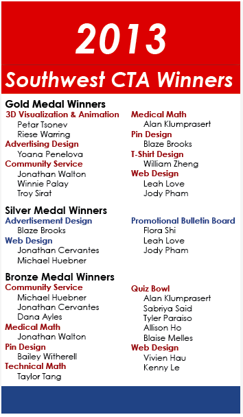 Gold Medal winners that qualified to go to Nationals! Community Service, Web Design, T-shirt Design, Pin Design, 3D Animation, and Medical Math.