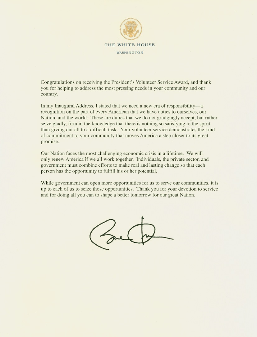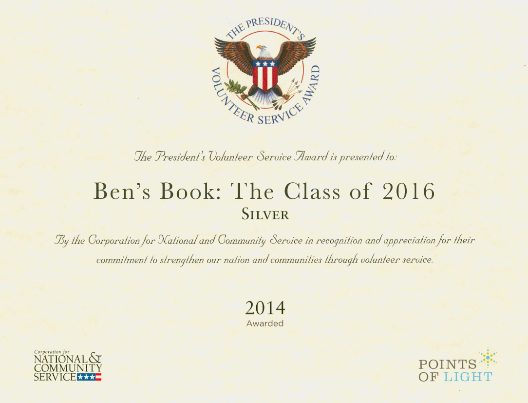 The President’s Volunteer Award recognizes students who volunteer. The junior class Video Game and Web students were recognized with a Silver Medal and a letter of recognition from President Obama for their hard work.